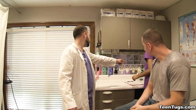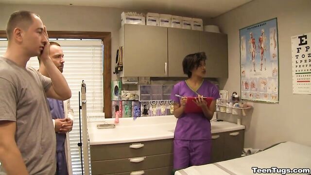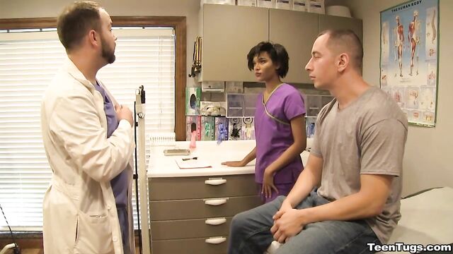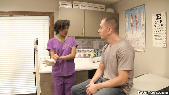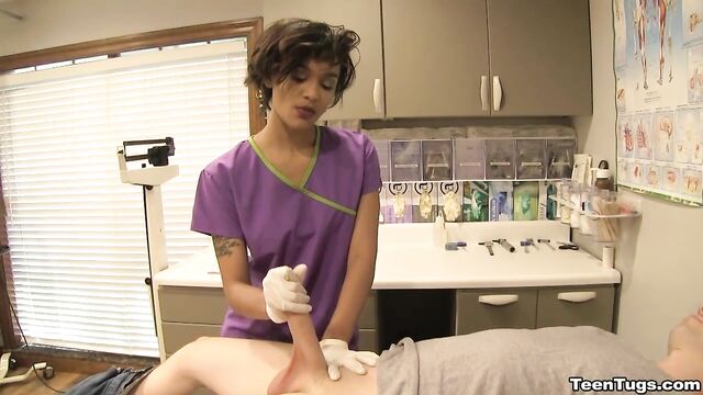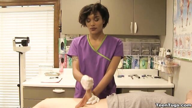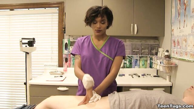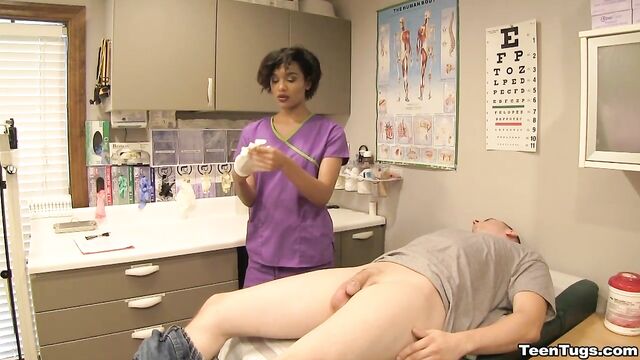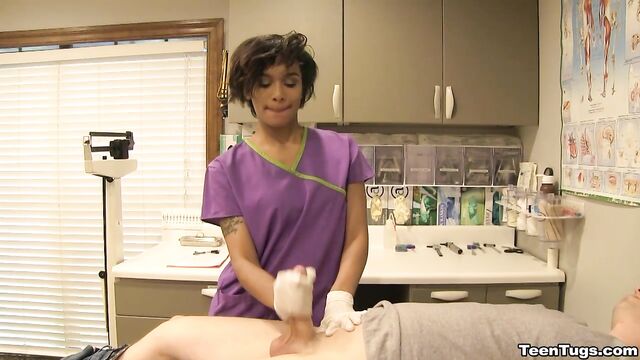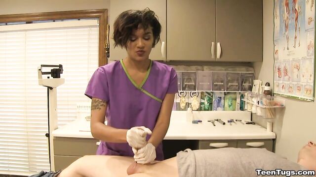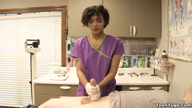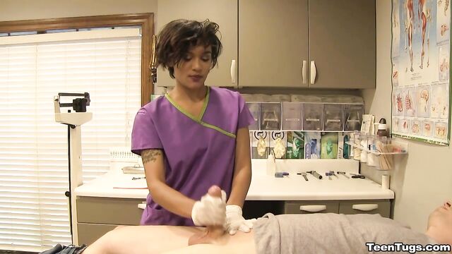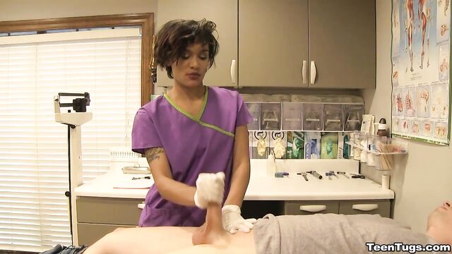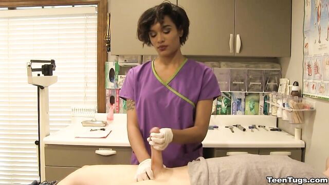 Description:John is in for his exam when the doc steps our for an emergency. Luckily Nurse Barnes is available to extract the needed samples. She pulls out his hard cock and milks him with latex gloves, stroking his hard cock until he accidentally explodes his semen, shooting his goo over his shirt. Nurse Jasmine believes shes has enough for a sample.