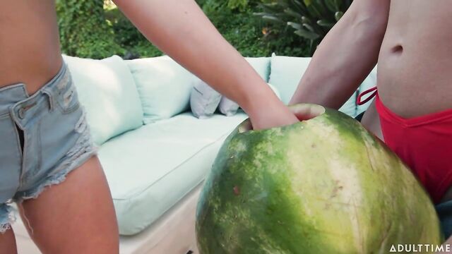 Description:Erica Cherry and Ariel Demure are hosting their annual backyard barbecue. Erica's on grill duties, while Ariel works on other preparations. When Aften Opal arrives, she takes the opportunity to snack on Erica's dick while Ariel is occupied.Ariel catches sight of what they're doing and, not wanting to make a scene, thinks of a clever way to get Aften's attention using nothing but her wits and a watermelon. Ariel sticks her dick into a hole in the watermelon, and invites Aften to come closer. When Aften realizes that Ariel's cock is inside the melon, she reaches inside to give Ariel a handjob. Not wanting to be left out of the fun, Erica pulls down Aften's shorts and fucks her from behind, leading to a fun threesome!