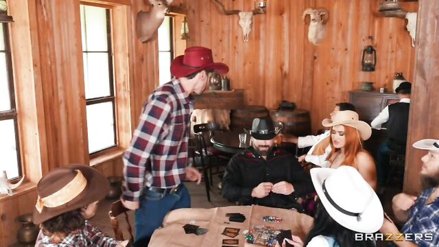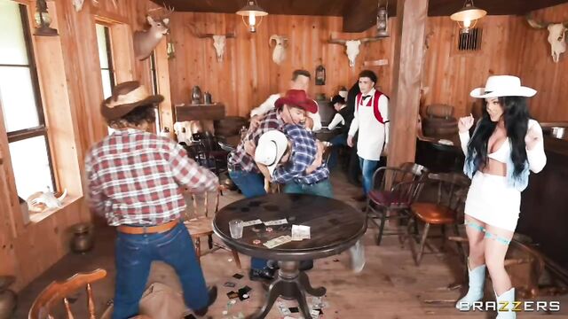 Description:Jennifer White is a sassy card playing badass who’s looking for trouble in a western saloon. Jennifer joins an intense game with the locals, and has her eyes set on GI Joey for some sneaky fun. Nia Blue sees Jennifer up to no good and gets in on the action. Nia and Jennifer waste no time pulling Joey’s cock out right at the table for a footjob. The locals suspect foul play and flip the table revealing the hanky panky. Joey grabs Nia and pulls her away to give her pussy a pounding. Jennifer takes care of the locals and grabs Joey’s cock for herself. Suddenly, Lolly Dames arrives and reminds Nia who’s boss. Jennifer pulls a sneaky attack on Lolly and locks her up to get Nia’s help in a hardcore threesome