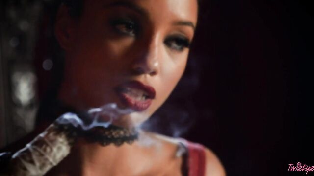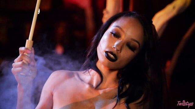 Description:Your October Treat of the Month is a little spooky but very sweet! Alexis Tae brings some supernatural sex appeal as she does a steamy striptease in all black, spanking her tight booty with a lace fan. Alexis keeps the heat going with a hot tease in lacy lingerie and a filmy black veil, undulating her hot body for you. Finally, Alexis casts a spell as a sexy witch on her throne, taking off her clothes and playing with her enchanting slender body. This sultry seductress caresses her clit and slides her fingers into her pussy, and she's got a naughty twist: hot candle wax that she drips over her perfect skin before making herself cum!