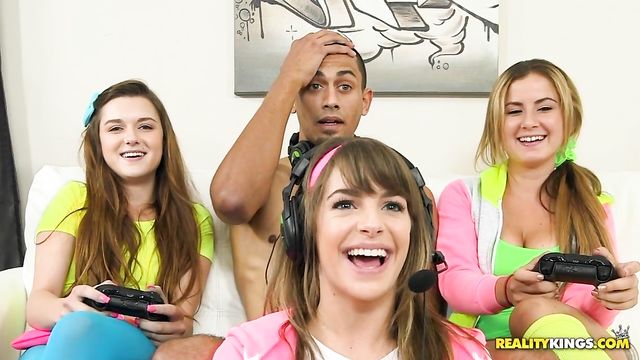 Description:Alex, Kimmy, and Payton were three sexy girls playing video games this weekend afternoon. They were in super casual wear, t-shirts and undies. Their roommate came in and jumped in the middle of them. He started bragging on how great he was at the game they were playing. He even bet them he could utterly destroy them in the game. Being a nice guy, he said they had to do the dishes and trash for him for a week. The girls being a little more vindictive wanted him to streak on the front lawn if he lost Being confident in his skills he made the bet. They got into the game, and he had to take a phone call. While on the phone, the girls decide to make sure they'd win and tweaked his controller. Their roommate came back and was soon naked standing in front of them. But once the girls saw the size of his cock, they wanted to have a little fun with it before he streaked. Kimmy grabbed that cock and started going to town as she tried to get it down her throat. We watched her tits and ass bounce in her cut-off T and underwear. Payton wanted a piece as well and got a mouthful before Kimmy got on top for a ride. The girls all took turns and got their game on with their roommates joystick. The three joined forces and sucked him off until they got a cum-filled power-up.