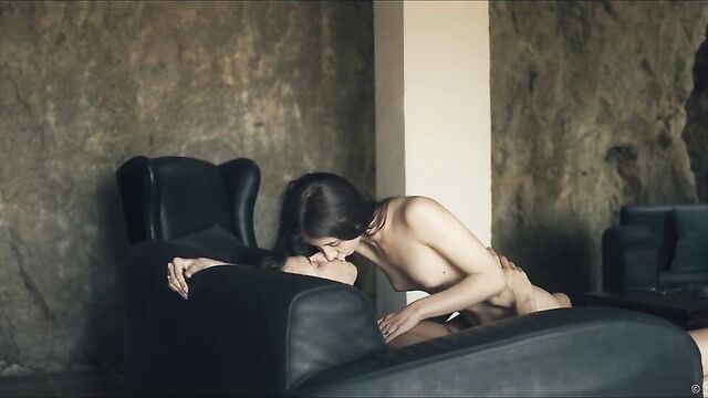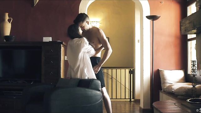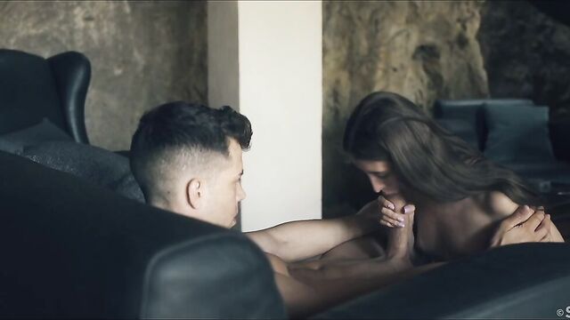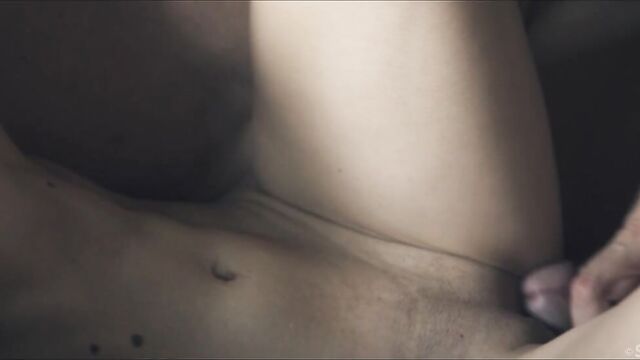Description:Affection meets raw lust in erotic movie "Tender Moment" by Andrej Lupin. Sexy Stefany Moon, a petite and pretty Russian brunette, wakes alone in a tangle of white sheets. Topless in pink panties, she exposes small, natural breasts as she stretches then gets out of bed to look for her man, Alberto Blanco. Playfully, she covers up with his white shirt then finds him lifting weights in the basement. She admires his dark good looks and ripped body, tempting him to abandon his workout. In the living room, they make out and Stefany takes off the shirt. Alberto carries her to the couch, with her legs wrapped around his waist, settling back with her on top. She takes control, dry-humping him through their underwear, then frees his huge cock, jacking it rock hard before removing his shorts. The tip is already oozing wet as she teases his head and shaft with her lips and tongue. Then she sucks him, with one manicured hand gliding up and down his rigid shaft. She strips off her panties and straddles him, playing his cock against her shaved pussy before guiding it inside. He holds her close and she gasps and yelps as she rides him hard. When Stefany sinks down to take his full length, Alberto takes charge, lifting her and laying her down on the couch, cock deep inside of her all the while. He plows her soaked pussy missionary style, thrusting slowly. Next, he lies beside her on the couch, with her ass against his crotch and legs splayed to open her up as he thrusts balls-deep in her snatch and caresses her tits. Their mutual adoration is obvious – this gorgeous couple can’t stop kissing – and it fuels their insatiable fucking. As Stefany’s orgasm starts to build she fingers her clit and Alberto strains to hold back, determined that she should cum first. Her body spasms, pussy clamping tight around his cock and, as he climaxes, he pulls out, splashing her belly, mound and tits with his load.